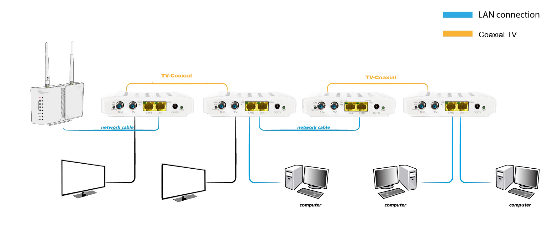 • Bis zu 1GB Mbps G.hn Datenverbindung als Heimnetzwerk mit einer vorhandenen Coax TV-Verkabelung. Alle Antennendosen, Verteiler, Verstärker etc. im Signalweg müssen rückkanalfähig sein (für volle Leistung bis ca. 200MHz).