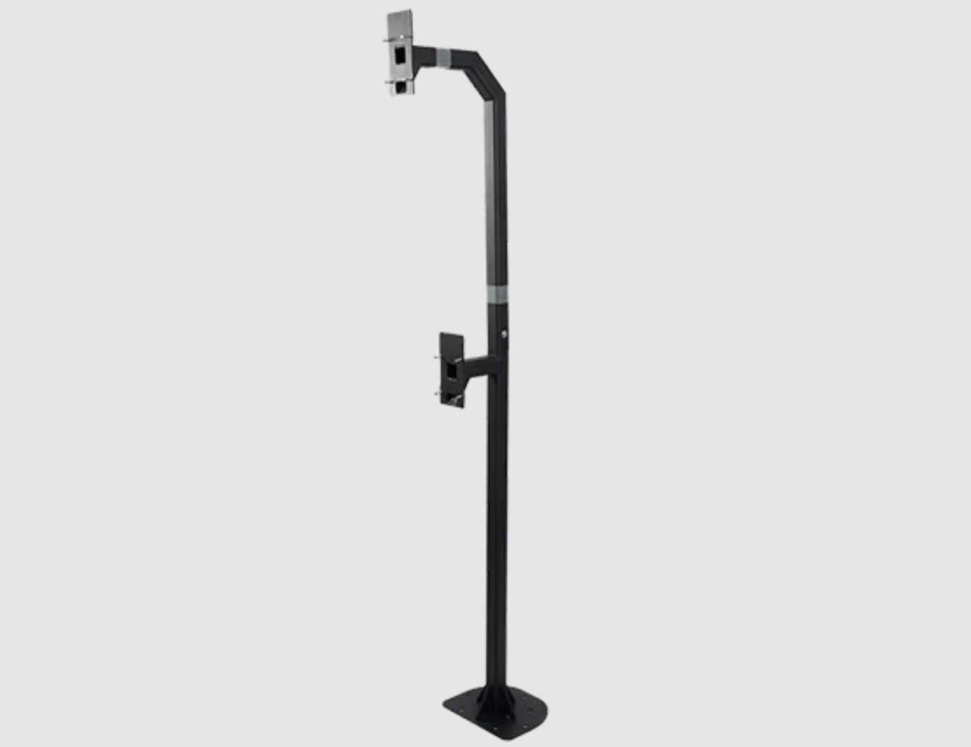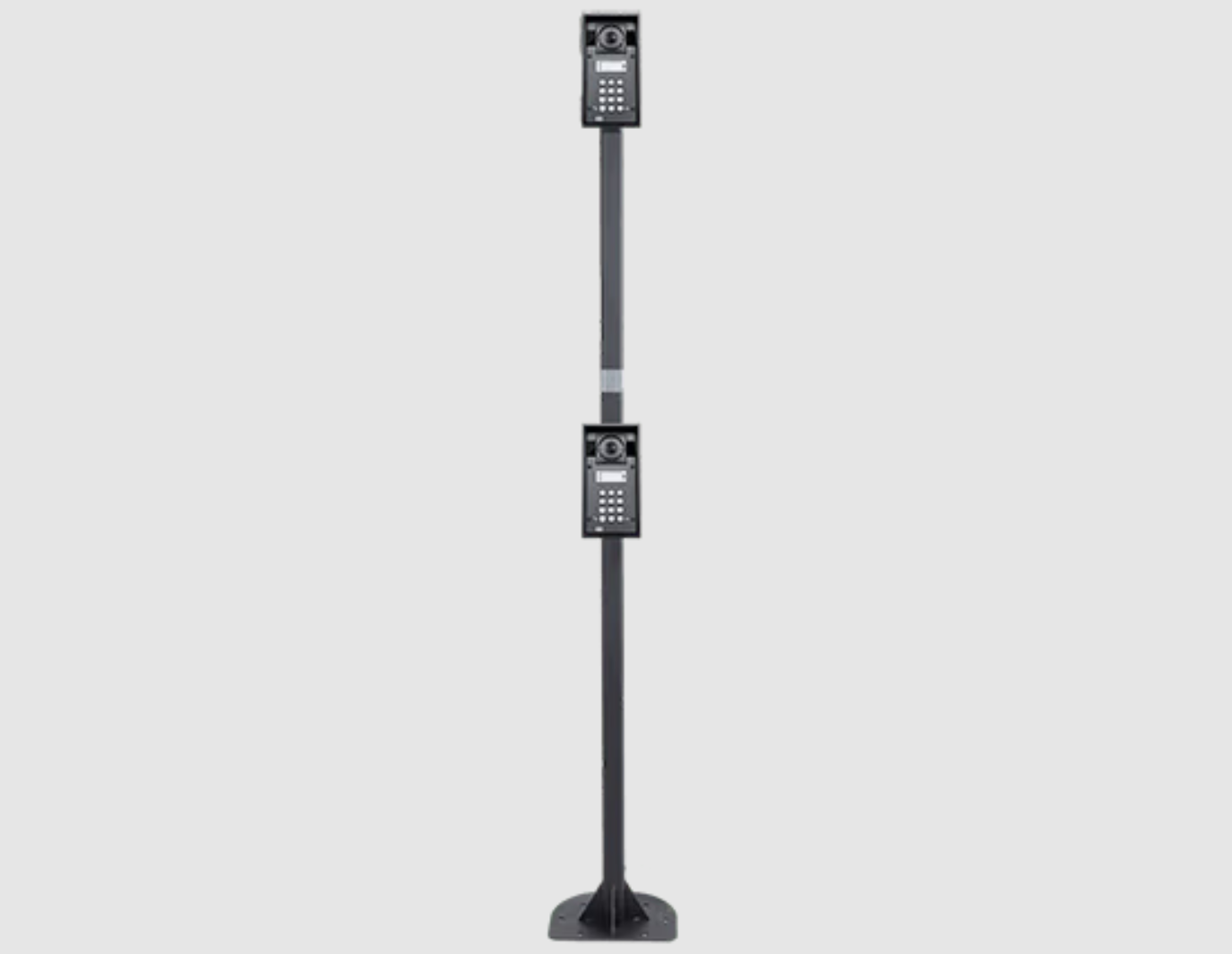 Eine massive Metallsäule zur Installation der 2N®-Force- und 2N®-Safety-Intercoms an Zufahrtstoren, durch die Personen- und Lastkraftwagen fahren. Wegen der besseren Sichtbarkeit in der Nacht ist die Säule mit einem reflektierenden Streifen versehen.