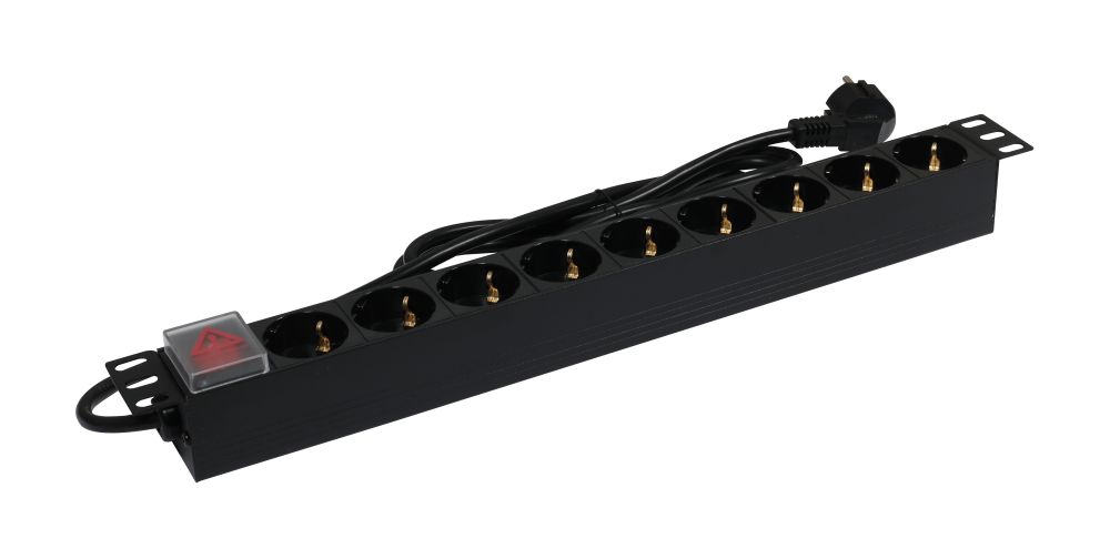 Leuchtwippschalter mit Abdeckung, Gehäuse Aluminium Schwarz, 19"/1HE, L=440mm, Zuleitung 2m(3x1,5mm²) mit Schutzkontaktstecker, 9xSchutzkontakt(Dosen,CEE7) -> Schutzkontakt(Stecker,CEE7), TUL-GER(16)N1009WKPB19A, 19" Winkel umbaubar für Tischbefestigung,