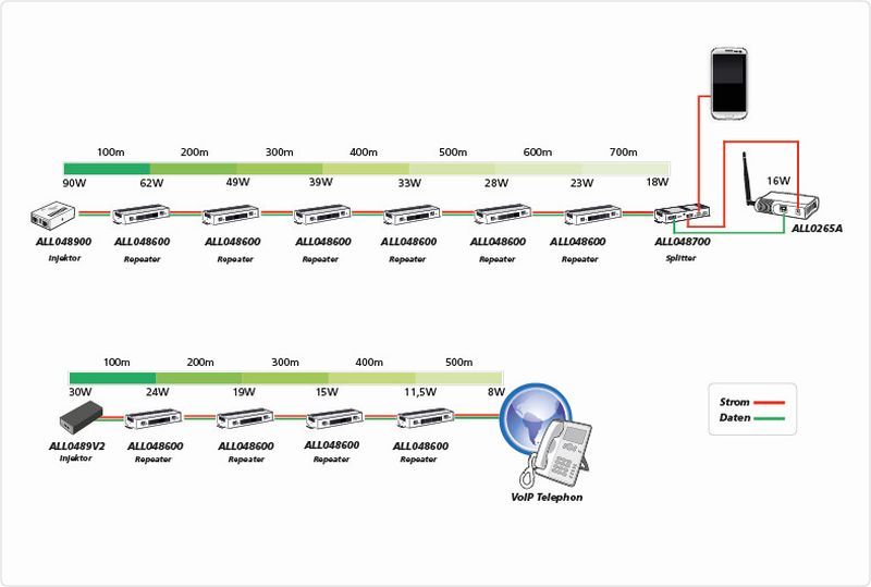 Der Power Over Ethernet Repeater ALLNET ALL048600 erweitert die PoE- und Netzwerkreichweite um 100m. Je nach PoE Eingangsleistung können bis zu 6 Repeater hintereinander verbunden werden. Wir empfehlen z.B. den ALLNET ALL048900 LT PoE Injektor für die Ausgangsleistung.