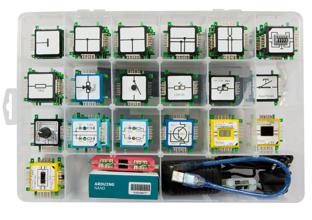 Das Arduino Set ermöglicht Interaktion und bietet so eine völlig neue Funktionalität für die Bricks. Mit dem Arduino Nano Brick lassen sich komplexe Schaltungen schnell und unkompliziert programmieren und realisieren. Neben mehreren LED-Bricks enthält das Set auch unterschiedliche Display-Typen und ermöglicht so eine große Flexibilität bei der Entwicklung eigener Lösungen.
