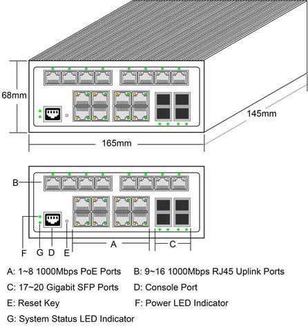 Power: Green Solid on--power work normal,off--power disconnected System:Green Blink--work normally, solid on--soft work abnormal, fast blink--soft upgrade PoE: Yellow Solid on--PoE work normally, Off--PoE doesn’t work, Blink--PoE overload 10/100/1000T RJ45 Interfaces (Port 1 to Port 16): 1000 LNK/ACT (Green), Blink--port connected with data transmission; Solid on--port connected without data transmission 100/1000Mbps SFP Interfaces (Port 17 to Port 20): Green Blink- port connected with data transmission; Solid on- port connected without data transmission |