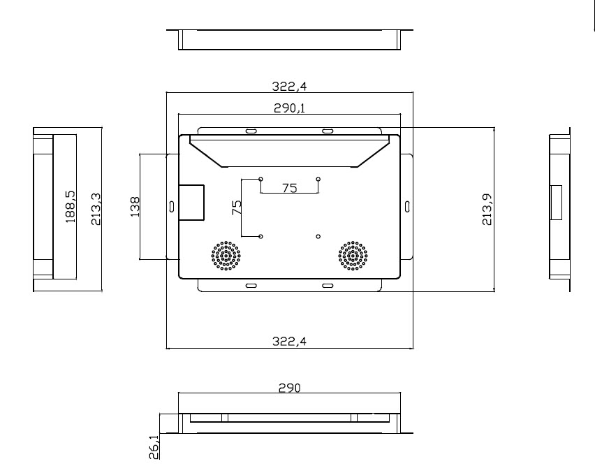 323mm x214mm x28mm inkl. Flansch von 18mm