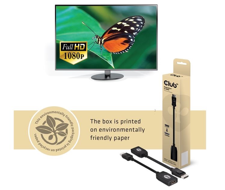 • Eingang: DisplayPort Stecker • Ausgang: HDMI Buchse • Passiver Club 3D DisplayPort auf HDMI Adapter • Konform mit der DisplayPort 1.1 Spezifikation • Konform zur HDMI 1.3 Spezifikation • Unterstützt Auflösungen bis zu WUXGA 1920x1200p@60Hz • Unterstützt High Definition Auflösungen bis zu Full HD 1080p@60Hz • Keine externe Versorgung notwendig • Unterstützt AMD, Nvidia und Intel HD/Iris Grafiklösungen • Kartongröße: 280x60x35mm • Adapter: 240x30x10mm • Gewicht: 52g • Meets ROHS, FCC, and CE EMI requirements