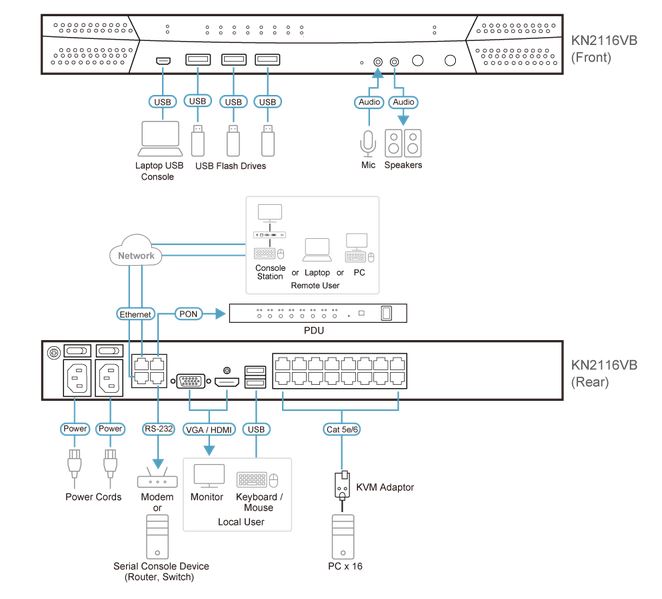 Die KN-Serie ist kompatibel mit ATENs KVM over IP-Konsolenstation - der KA82-Serie. Die KA82-Serie ist eine eigenständige Konsole, die den PC oder das NB ersetzt und den Benutzern den Fernzugriff, die Überwachung und die Steuerung aller Server ermöglicht, die mit mehreren ATEN KN-Serien verbunden sind, mit undurchdringlicher Sicherheit gegen Virenbedrohungen. Sie ist besonders für Umgebungen geeignet, in denen ein PC nicht erlaubt ist. Darüber hinaus arbeitet die KN-Serie mit ATENs PDU-Remote-Power-Management-Systemen über die Benutzeroberfläche der KVM über IP-Switches zusammen.