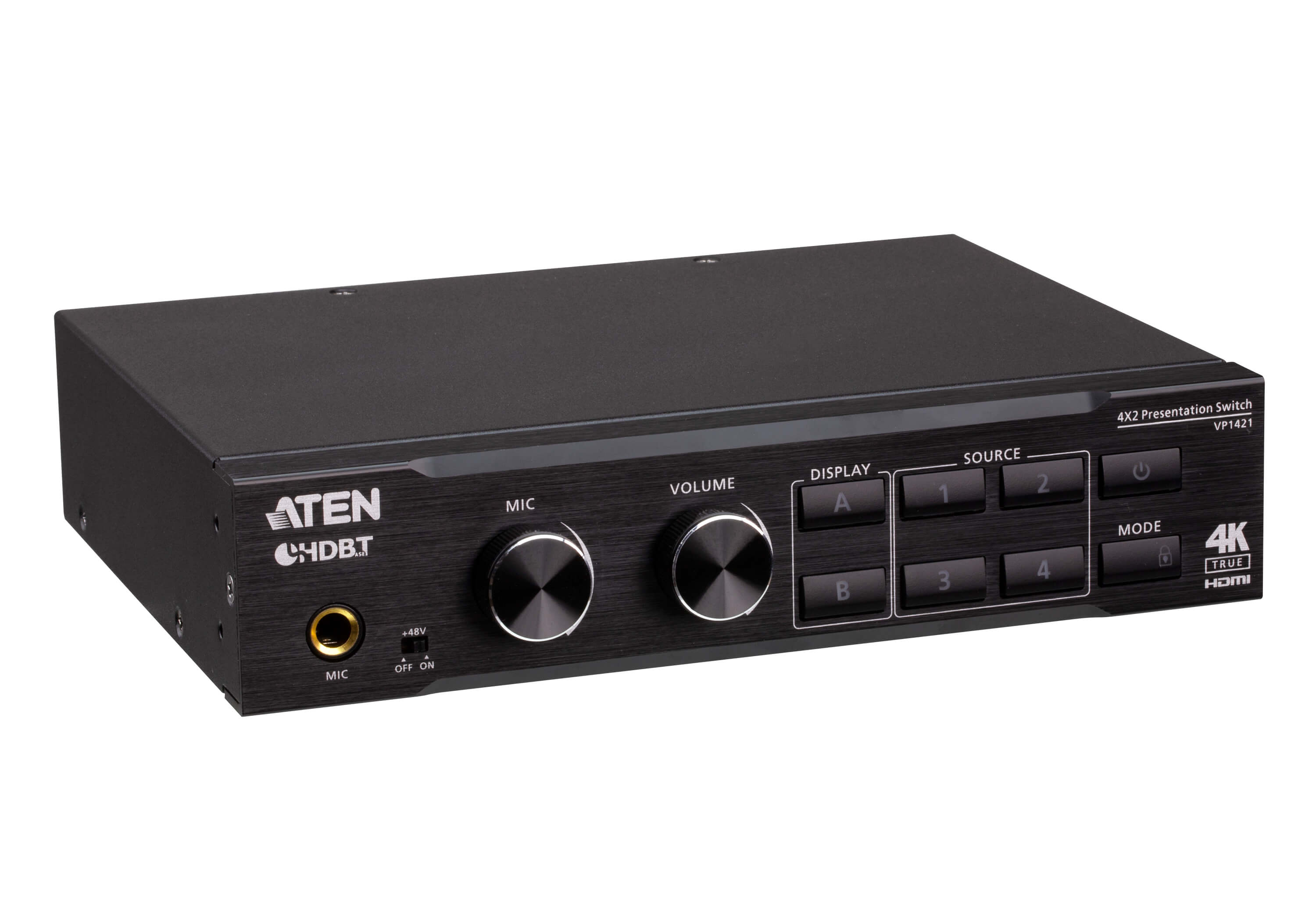 Aten Video Switch, 3xInput(HDMI/VGA/HDBaseT), 2xOutput(HDMI/HDBaseT), 4 x 2 True 4K Präsentation, DSP und HDBaseT-Lite