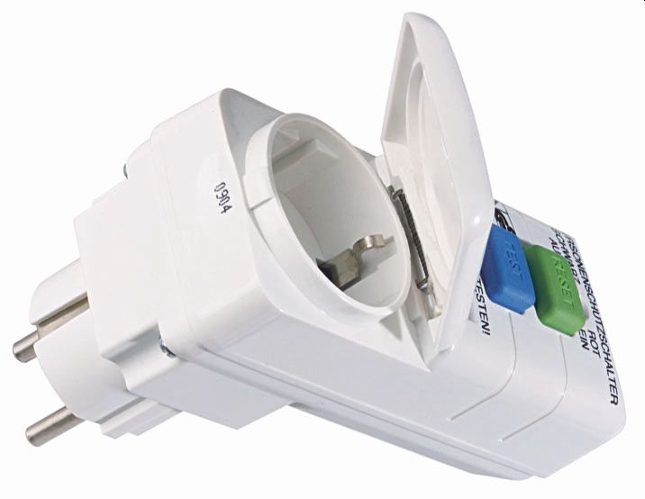 919.284, Fehlerstrom Schutzadapter weiß mit Klappdeckel - IP 44 < 30mA Auslösestrom < 30ms Auslösezeit max. 3600W 16A 250V 50Hz