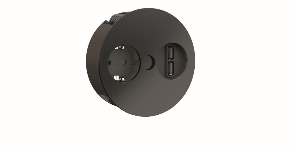 931.131, TWIST Metallische Abdeckscheibe in schwarz 30GE ähnlich RAL9005, seidenmatt 1xSchutzkontaktsteckdose schwarz mit erhöhtem Berührungsschutz 1xUSB-Doppelcharger 5V DC / 3,1A 2,0m H05VV-F3G1,5mm² schwarz mit Aderendhülsen inkl. beigelegtem Schutzkontakt-Montagezentralstecker schwarz, verpackt im Karton