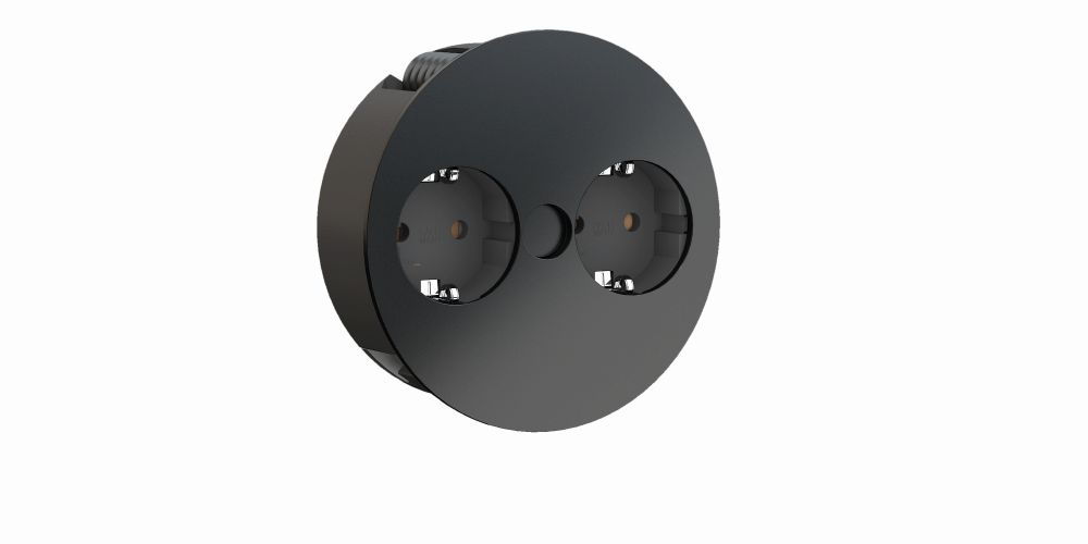 931.150, TWIST 2S Deckel in schwarz matt, ähnlich RAL 9005, 30GE seidenmatt 2xSchutzkontaktsteckdosen schwarz mit erhöhtem Berührungsschutz, Zuleitung 2,0m H05VV-F3G1,5mm² schwarz mit Aderendhülsen und beigelegtem Schutzkontakt-Montagezentralstecker schwarz, verpackt im Karton.