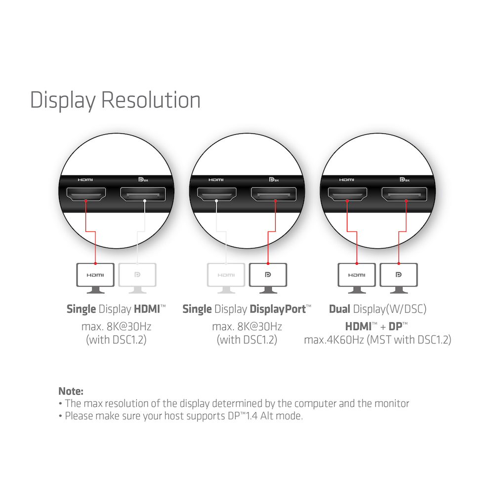 unterstützt • Eingang: • 1x USB Gen 1Type-C Male (Verbindung zum Host) Unterstützt DP1.4 Alt-Modus Hinweis: Um die maximale Bandbreite zu erhalten, sollte der Host den DP1.4 Alt-Modus unterstützen • Ausgang(e): • 1x HDMI Unterstützt max. 8K30Hz • 1x DisplayPort Unterstützt max. 8K30Hz; Unterstützt Dual Display HDMI+ DP max.4K60Hz (MST mit DSC1.2) Hinweis: Die maximale Auflösung des Displays wird durch den Computer und den Monitor bestimmt • 2x USB Gen 1 Typ-A Max. 5Gbps Datenübertragung pro Anschluss Unterstützt max. 7.5W(5V/1.5A) Downstream-Laden; 2 USB Gen 1 Typ-A Ports teilen sich einen maximalen Ausgang von 1,5A; Unterstützt Kurzschluss-, Überstrom- und Überspannungsschutz • 1x RJ45 Unterstützt Gigabit Ethernet, 10M/100M/1000M • 2x SD/Micro SD 3.0 Unterstützt UHS-I mit einer Datenrate von bis zu 832Mbps/104MB/s; Ermöglicht den gleichzeitigen Betrieb von 2 Kartensteckplätzen • 1x USB Gen 1 Typ-C Buchse (für PD Charging) Unterstützt max. 100W PD3.0 Aufladung; Unterstützt Fast Role Swap, das angeschlossene Gerät wird beim Ein- und Ausstecken des