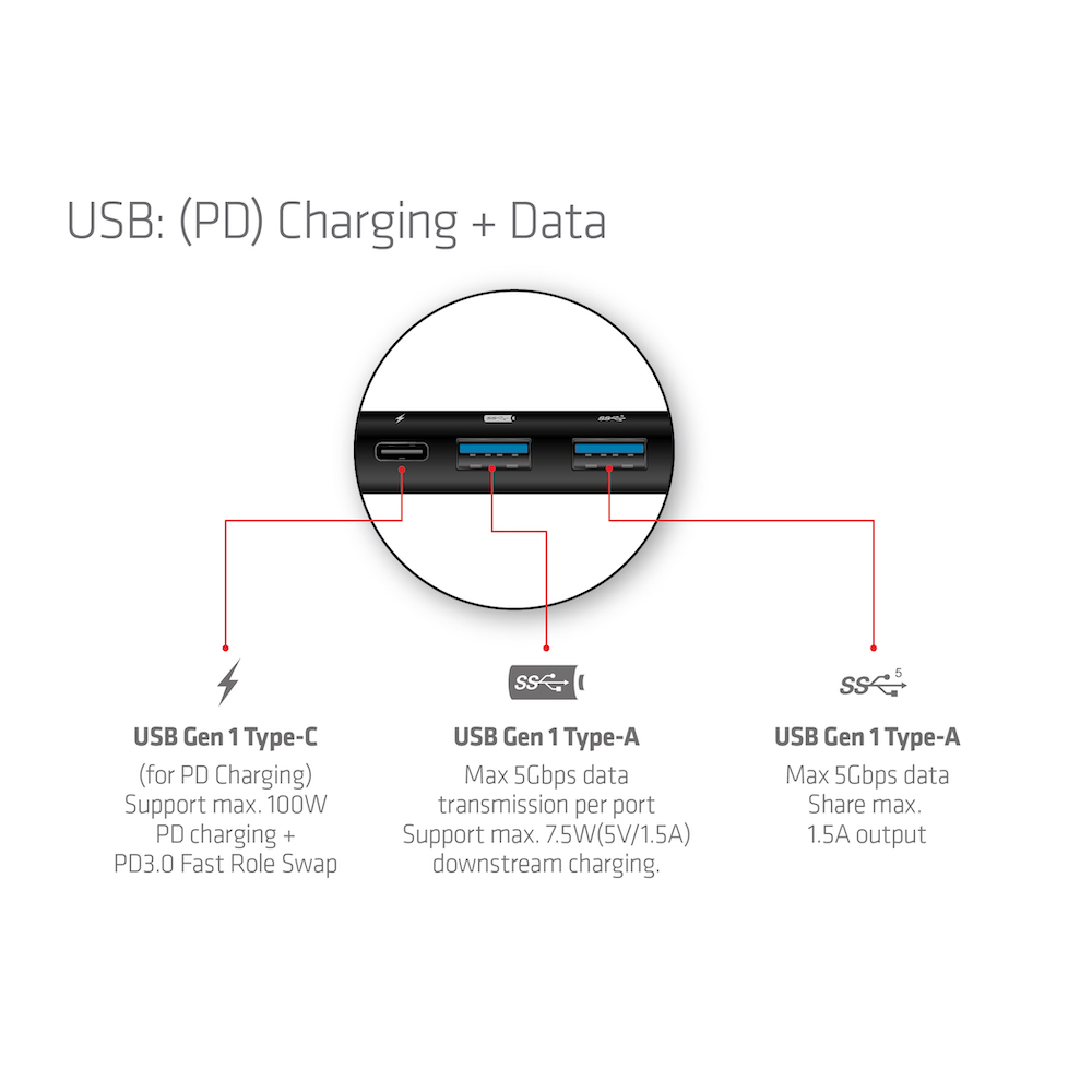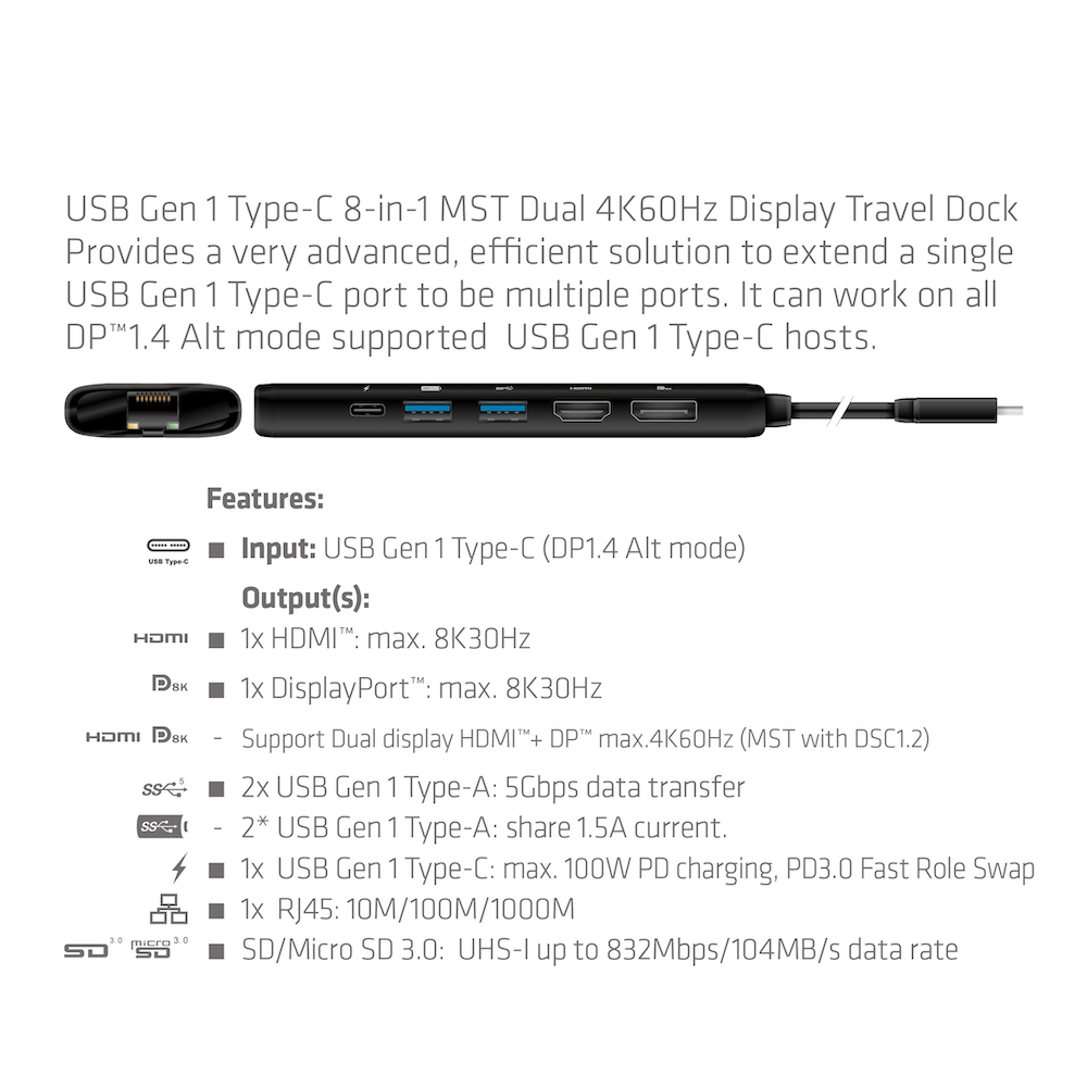 • Eingang: USB Gen 1 Typ-C Stecker (Verbindung zum Host) • Ausgang: 1x HDMI Buchse, 1x DisplayPort Buchse, 2x USB Gen 1 Typ-A Buchse, 1x RJ45, 1x SD/Micro SD 3.0, 1x USB Gen 1 Typ-C Buchse • Unterstützt DP1.4 Alt Modus max. 8K@30Hz (mit DSC1.2) • Unterstützt HDMI max. 8K@30Hz (mit DSC1.2) • Unterstützt Dual Display HDMI+ DP max.4K60Hz (MST mit DSC1.2) • Max. 5Gbps Datenübertragung pro USB Gen 1 Typ-A Anschluss • Unterstützt max. 7,5 W (5 V/1,5 A) Downstream-Laden, 2 USB Gen 1 Typ-A teilen sich max. 1,5 A Ausgang • Unterstützt Gigabit Ethernet 10M/100M/1000M • Unterstützt SD3.0 UHS-I mit einer Datenrate von bis zu 832Mbps/104MB/s, ermöglicht den gleichzeitigen Betrieb von 2 Kartensteckplätzen • Unterstützt PD3.0 mit max. 100W PD-Ladung • HINWEIS: Bitte stellen Sie sicher, dass Ihr Host den DP1.4 Alt-Modus