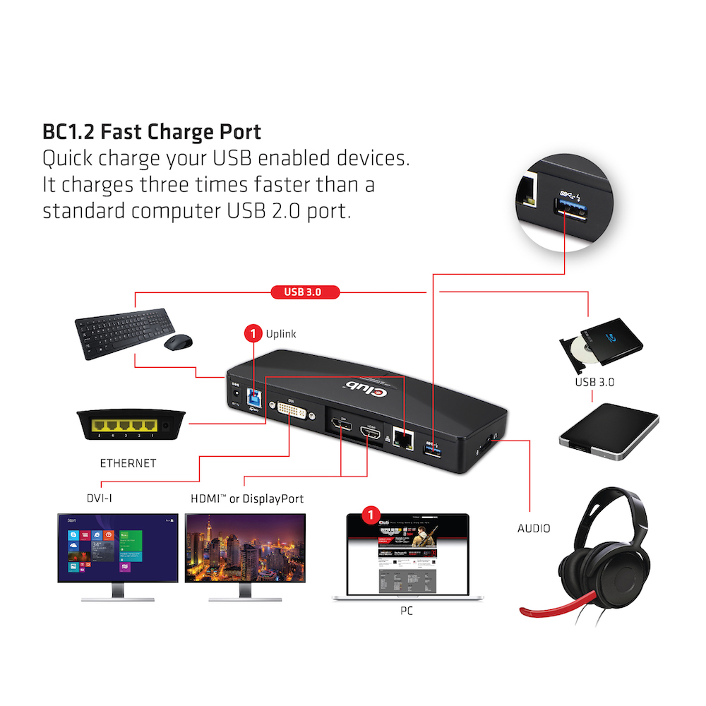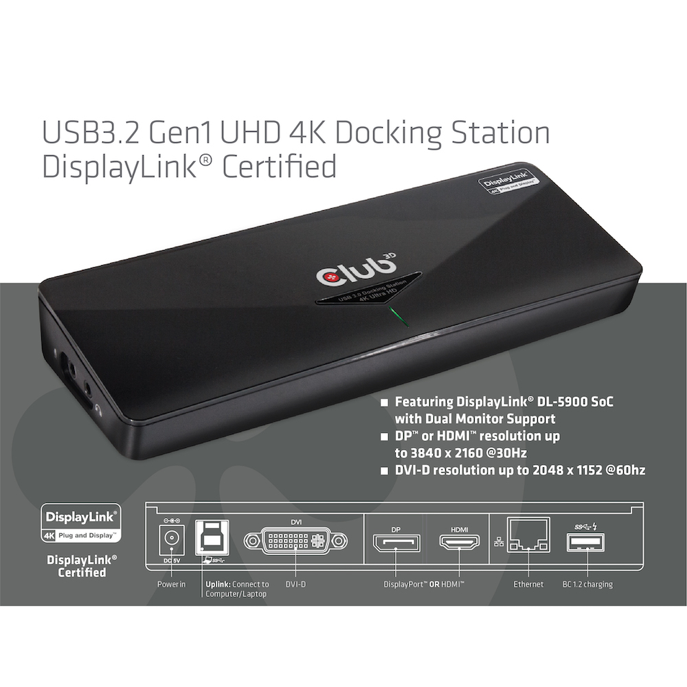 • Eingang: 1x USB 3.0 Buchse • Ausgänge: 3x USB 3.0 mit 1x BC 1.2 Charging Buchse, 1x HDMI oder Displayport Buchse, 1x DVI Buchse, 1x Ethernet Buchse, 1x 3.5mm Audio 2.1 Ch Buchse, 1x 3.5mm Mic Buchse • Featuring DisplayLink DL-5900 SoC und Dual Monitor Unterstützung • Unterstützt Auflösungen bis zu: Für Single Monitor Setup (DP oder HDMI): 3840x2160 bei 30Hz, Für Dual Monitor Setup: 2x 2048x1152 (order 1920x1200) @60Hz • Kompatibel mit den USB 3.0 Spezifikationen • Audio 2.1 Channel Anschluss 3.5mm Buchse • Mikrofon Anschluss 3.5mm Buchse • Unterstützt Gigabit Ethernet 10/100/1000 • Unterstützt BC 1.2 Charging für schnelles Laden Ihrer kompatiblen Produkte • Kartongröße: 265x168x81mm • Produktgröße: 189x74,5x26,3mm • Kabellänge: 1000mm • Gewicht: 200g (ohne Netzteil)