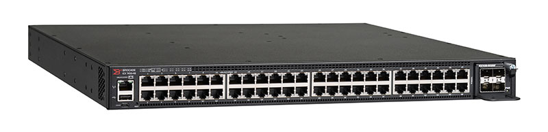 Ruckus Networks ICX 7450 Switch 48-port 1 GbE switch bundle includes 4x10G SFP+ uplinks, 2x40G QSFP+ uplinks/stacking, 1x250W AC power supply and one fan, front to back airflow
