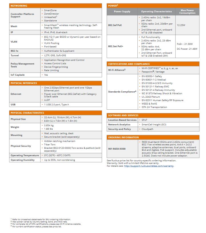 CommScope RUCKUS RUCKUS Unleashed R650 dual-band 802.11ax Wifi6 Wireless Access Point 4x4:4 + 2x2:2 streams