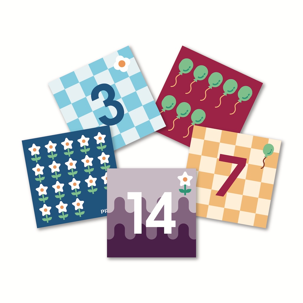 36 doppelseitige Karten mit den Zahlen 1-20, Vielfachen von 5 und den grundlegenden mathematischen Symbolen (+, -, ×, ÷, =)