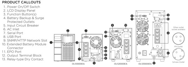 On-Line Doppelwandler, (1) USB, (1) seriell, (1) Relay, (1) EPO, (6) IEC C13, (1) C19