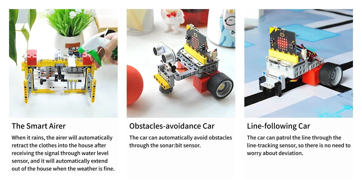 Vollgepackt mit verschiedenen elektronischen Sensoren wie dem Linienfolgesensor, dem Sonar:bit und dem Wasserstandssensor bereichern sie die Projekte um mehr Herausforderung und Spaß.