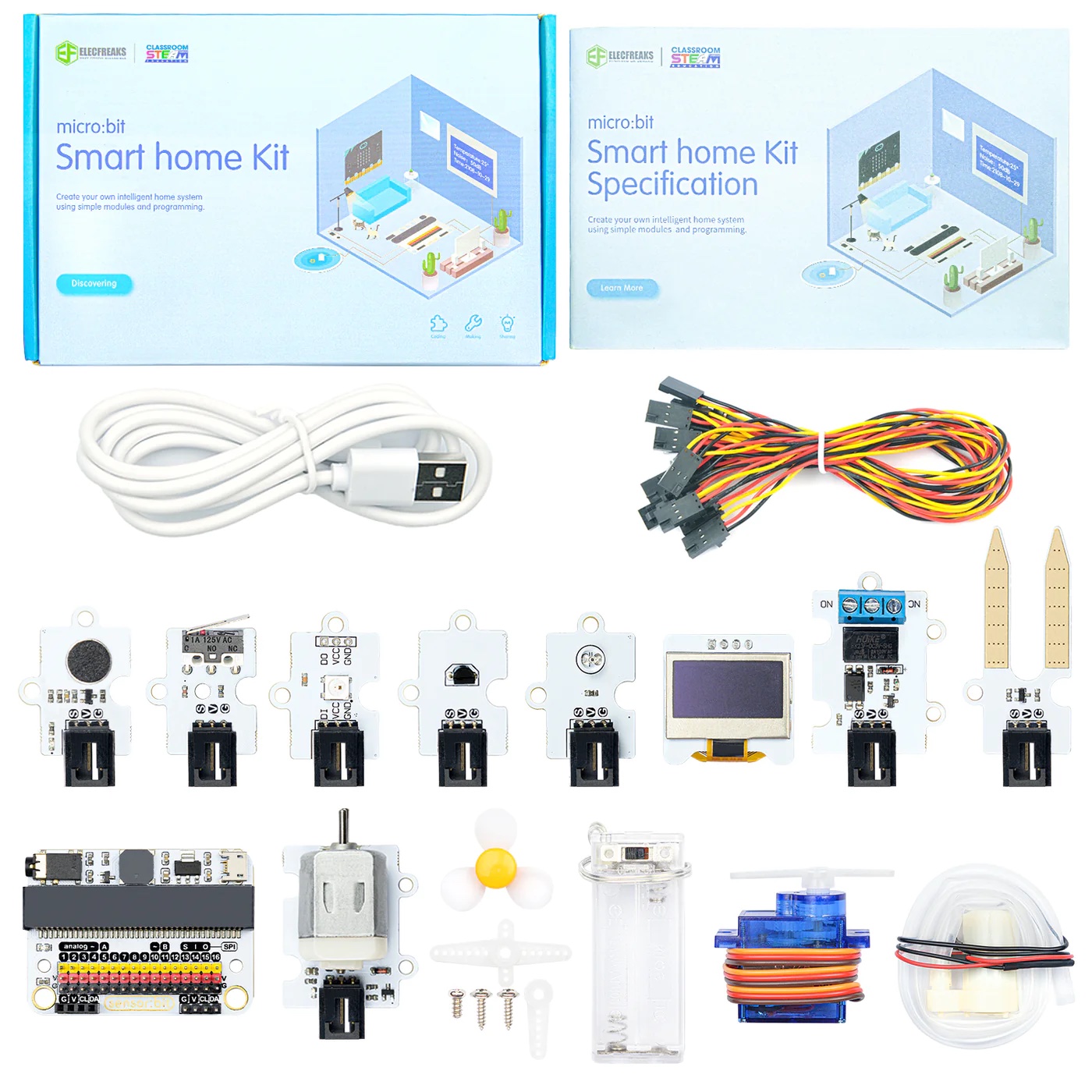 Das Smart Home Kit ist ein von ELECFREAK entwickeltes Produkt für Smart-Home-Projekte auf Basis von micro:bit. Wir haben Komponenten ausgewählt, die häufig zu Hause verwendet werden, wie den TMP36 Temperatursensor, den Schallsensor, den Kollisionssensor, den Servo und den Motor. Sie können Szenen wie Fensterbank, Kleiderschrank und Aquarium nachbauen, um sich ein intelligentes Zuhause zu schaffen, und programmieren, welche Funktionen sie mit dem micro:bit intelligent steuern. Ein intelligentes Zuhause macht das Leben praktischer und das Experimentieren damit macht das Leben interessanter.