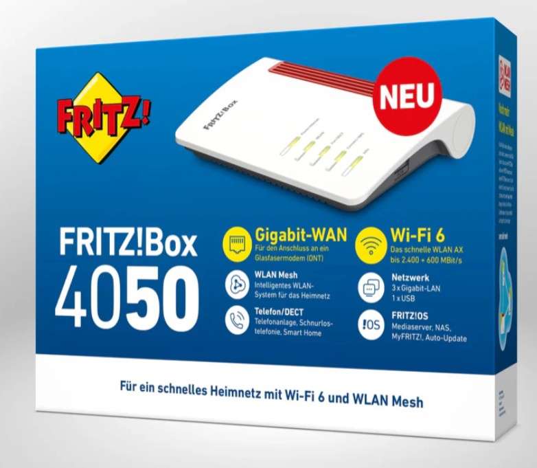 • WLAN-Router für ein Glasfaser-, Kabel-, DSL-Modem oder einen Mobilfunkstick • 1x Gigabit-WAN, 3x Gigabit-LAN • Optimal für Videostreaming und IPTV • Wi-Fi 6 (WLAN AX) bis 2.400 MBit/s (5 GHz) und 600 MBit/s (2,4 GHz) • Vergrößert das Heimnetz mit WLAN Mesh – mehrere WLAN-Zugangspunkte einfach zu einem intelligenten System zusammenfassen • DECT-Basis für Telefonie (VoIP) und Smart Home • Integrierte DECT-Basis für bis zu 6 Schnurlostelefone • 1 Anschluss für ein analoges Telefon, Anrufbeantworter oder Fax • Smart-Home-Funktionen für Strom, Wärme, Licht und mehr (DECT ULE) • 1x USB für Drucker und Speicher im Netz (USB 2.0) • FRITZ!NAS - ein gemeinsamer Speicher für alle Daten im Heimnetz • Mediaserver verteilt Musik, Bilder und Filme im Heimnetz (DLNA/UPnP AV)