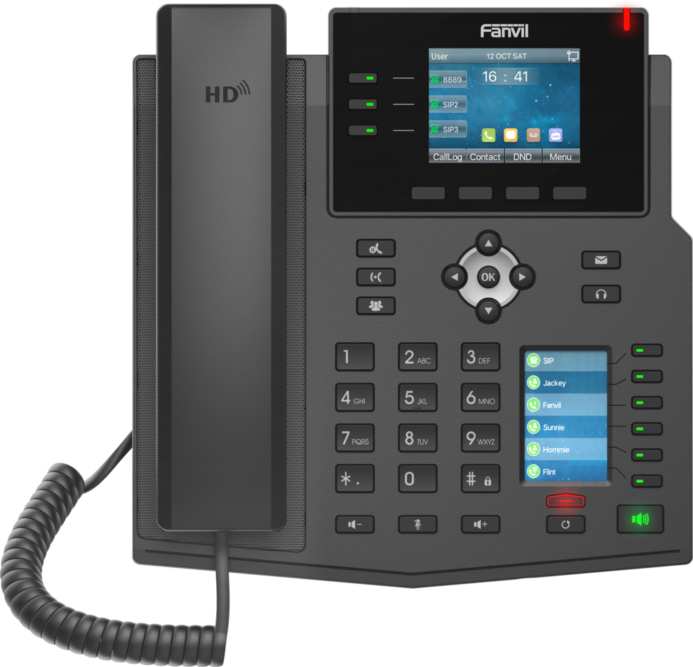Das Fanvil X4U V2 ist ein leistungsfähiges Business-IP-Telefon mit zwei Farbdisplays (2,8" Haupt- und 2,4" Nebenbildschirm) und integrierter DSS-Tastenerweiterung für bis zu 30 Funktionen. Es unterstützt bis zu 12 SIP-Leitungen, bietet Dual-Gigabit-Ethernet mit PoE, USB-Port für WLAN-/Bluetooth-Dongles oder Aufzeichnung und EHS-Headset-Unterstützung :contentReference[oaicite:1]{index=1}.