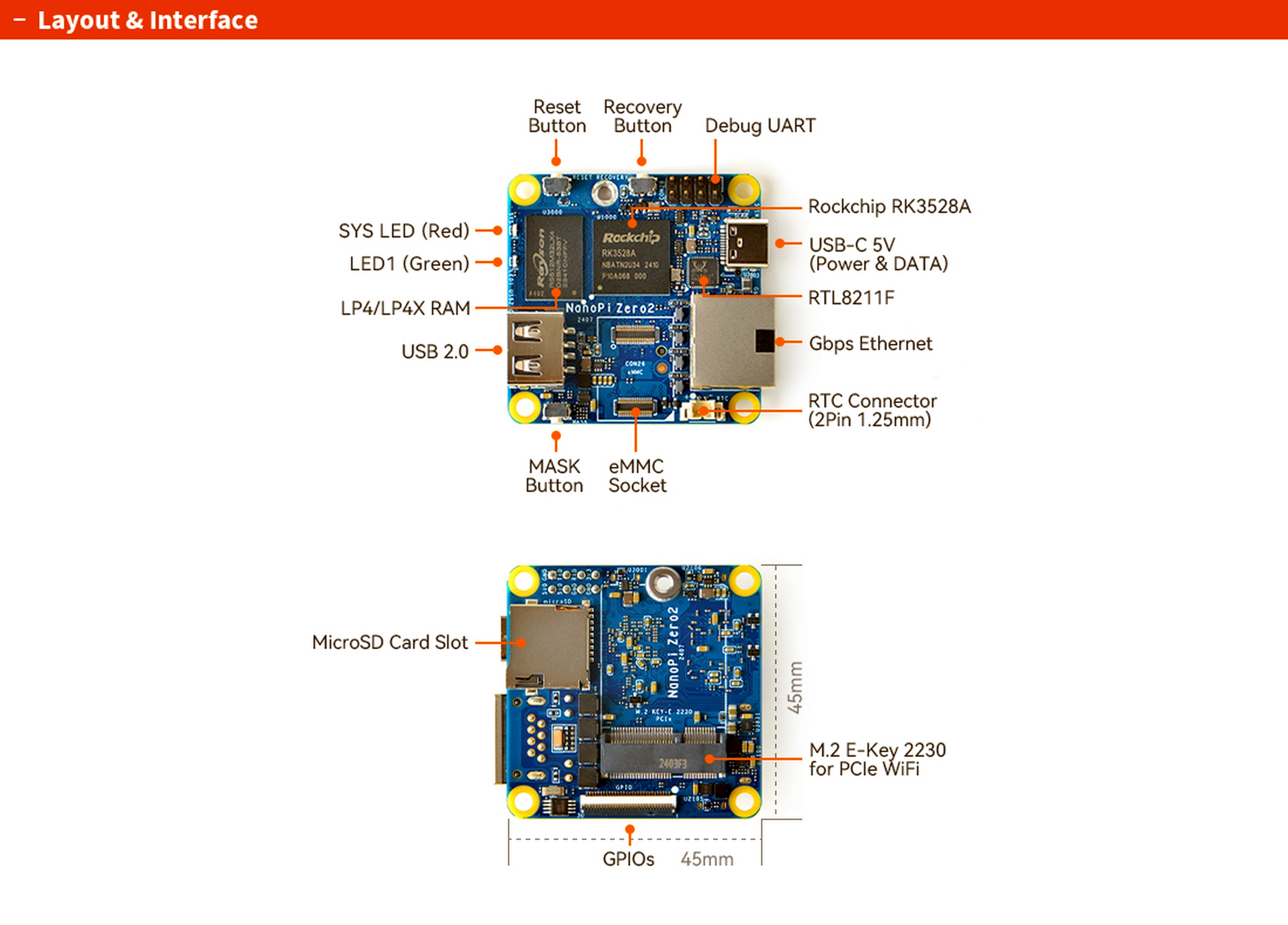 - Power supply: DC 5V/2A, via USB-C connector or 2.54mm Header