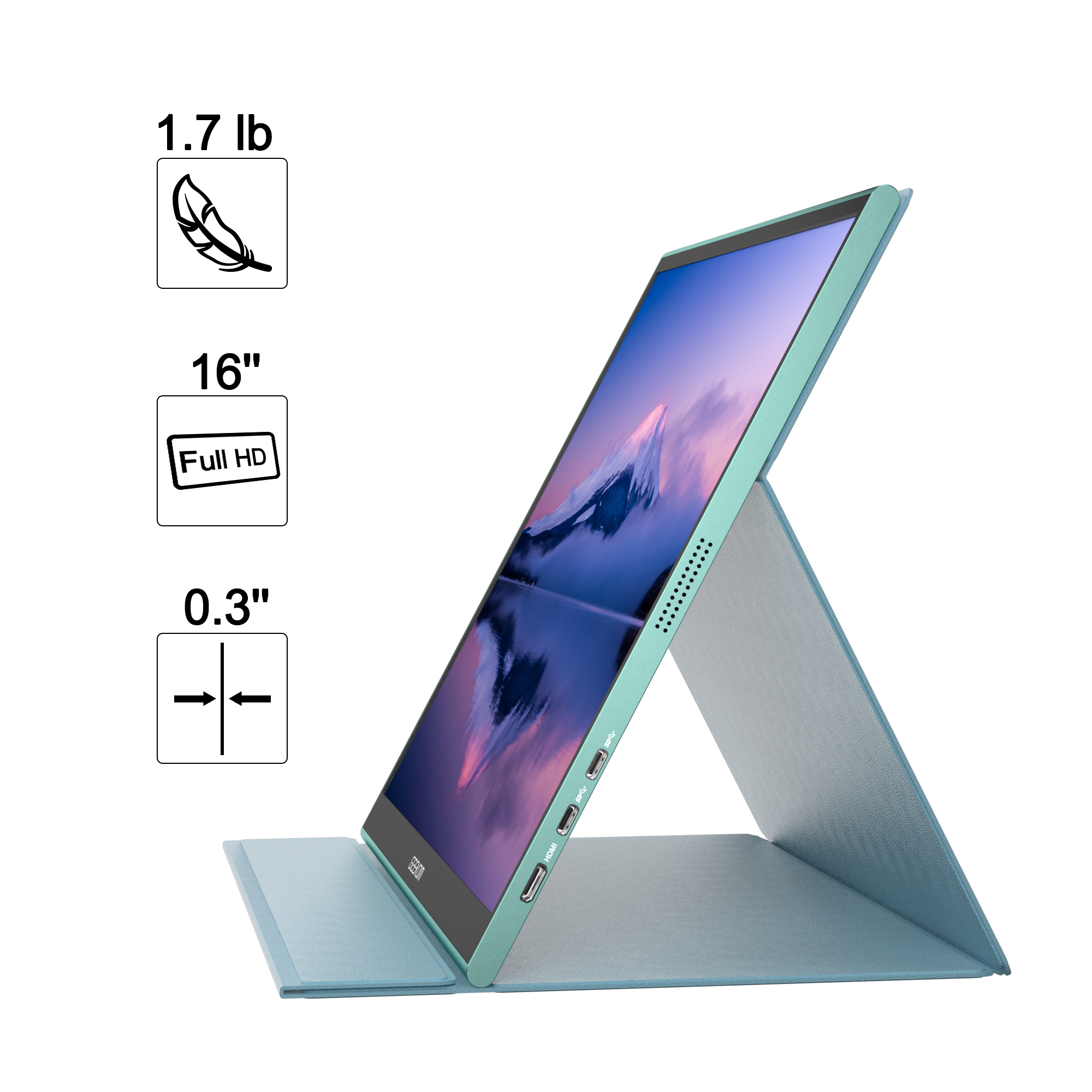• 16-inch 16:10 screen • IPS screen,178 ° Viewing angle, 800:1, 1080P FHD (1920x1200) • 2 in 1 Protective Cover Case • Built-in dual speakers • Universal compatibility, Plug-and-play • 1x Mini-HDMI, 2x USB-C
