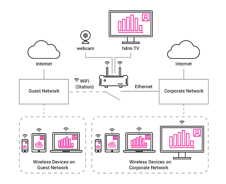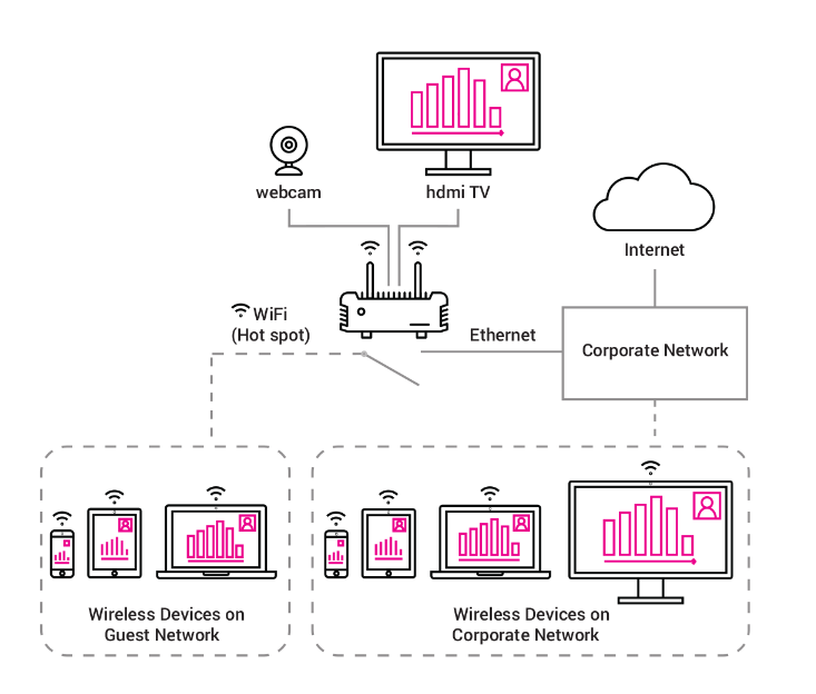 Huddle hub One+ Multi Room Edition ermöglicht allen Meeting Teilnehmern eine echte BYOD kabellose Interaktion mit der Raum-AV-Anlage für Content-Sharing und Videokonferenzen. Das Huddle Hub One + besitzt 3 Modi, den Direct mode, den Infrastructure mode und den Ethernet mode.