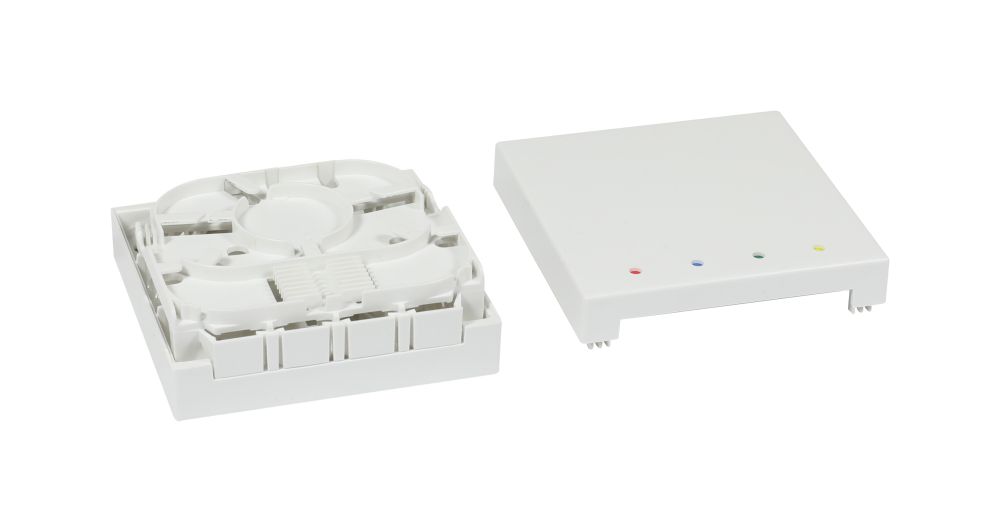 LWL-FTTH Wandgehäuse, für 4 Kupplungen SC-S oder LC-D 80x80 mit Kabelführung, DIN-Rail/Wand, Crimp, Synergy 21
