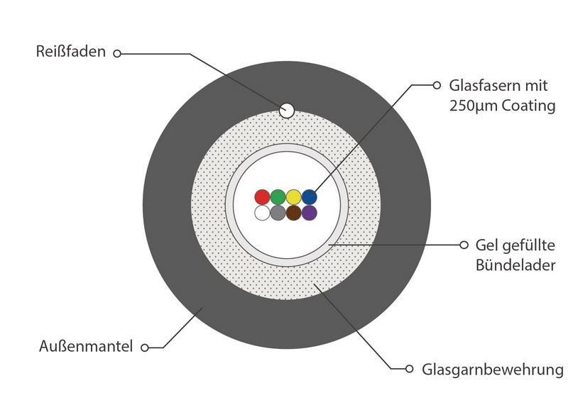 Das Glasfaserkabel mit zentraler, gelgefüllter Bündelader und bis zu 24 Fasern eignet sich ideal für Außenanwendungen in modernen Telekommunikationsnetzen. Die dielektrische Konstruktion mit Glasgarnarmierung macht es längswasserdicht und widerstandsfähig gegen mechanische Belastungen. Ein robuster LDPE-Außenmantel schützt das Kabel zusätzlich vor Umwelteinflüssen.