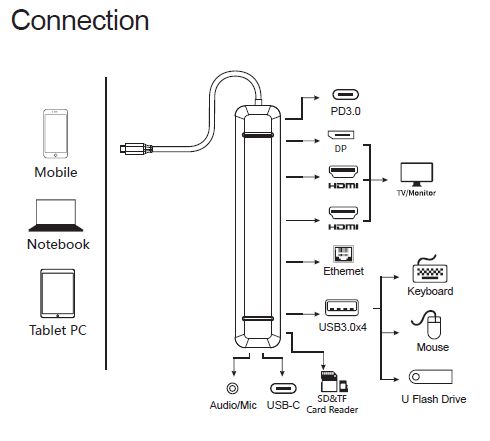 In der schlichten und eleganten Plusonic Dockingstation sind alle wichtigen Anschlüsse für Ihren Computer/Laptop vereint. Der Adapter erweitert Ihren Laptop um 9 zusätzliche Funktionen wie z.B. einen Micro-SD Kartenslot, einen SD Kartenslot, einen USB-C-PD3.0 Port mit max. 100W Leistung, 2x 4K HDMI-, 1x DP, vier USB 3.0-A-Anschlüsse, 3,5mm Klinkenport, einen USB-Typ-C Port und eine Gigabit LAN Schnittstelle. Dank des kompakten Designs passt der Adapter auf den Schreibtisch, kann aber auch ganz einfach mobil eingesetzt werden.
