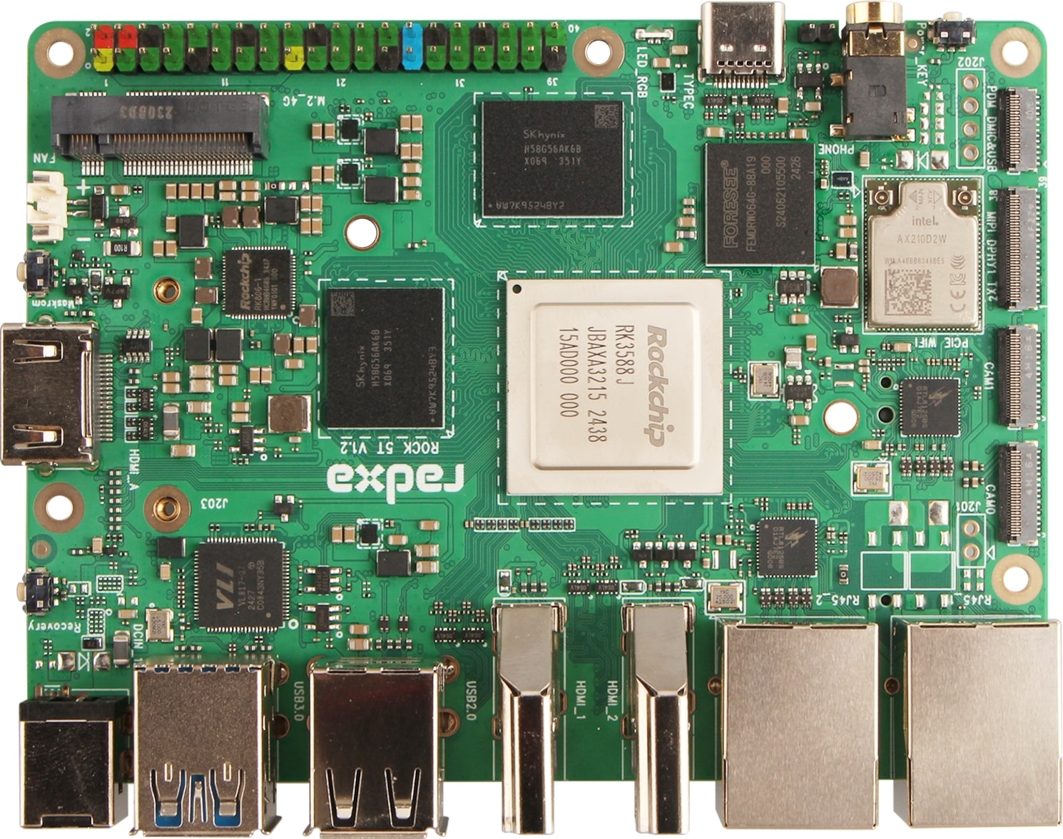 Der ROCK 5T bietet herausragende Multimedia-Verarbeitungsfähigkeiten, eine Vielzahl von Schnittstellen und erfüllt die Anforderungen an komplexe Datenverarbeitung und hochauflösende Videoausgabe, was ihn zu einer ausgezeichneten Wahl für Edge Computing und eingebettete Systeme macht. Radxa bietet verschiedene Optionen für LPDDR5-Speicherkonfigurationen auf dem ROCK 5T Board: Rockchip RK3588 oder RK3588J 64bit octa core ARM basierte SBC's