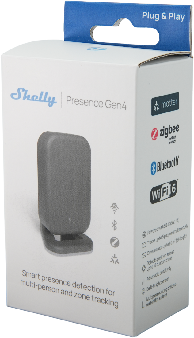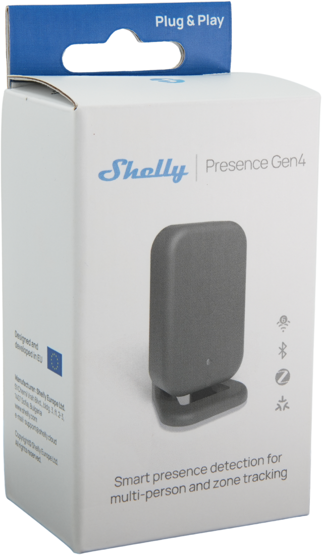 Produktinformationen "Shelly · Plug & Play · "Presence Sensor Gen4 Black" · Präsenzmelder · WLAN · Matter · Zigbee · BT · schwarz"
