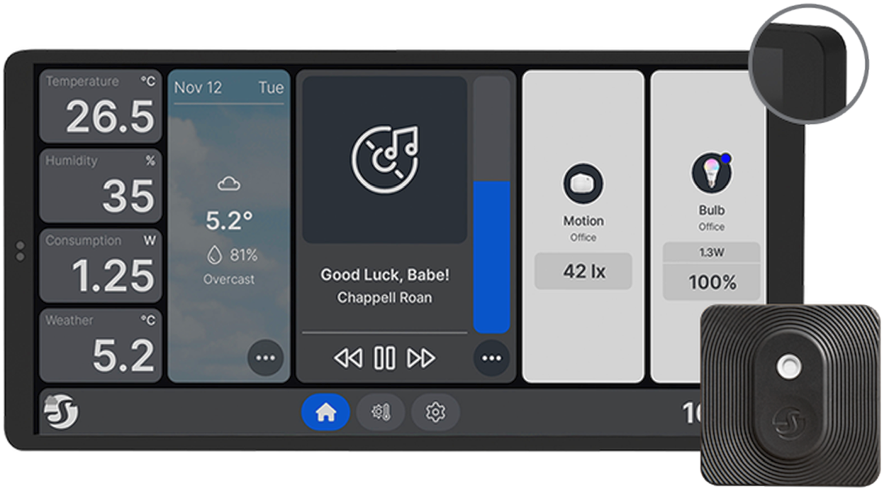 Mit einem großen 6,95"-Farb-Touchscreen macht dieses ultimative Smart-Home-Display das Überwachen, Steuern und Umschalten von Stromkreisen kinderleicht – alles mit einem eleganten und intuitiven Gerät. Für eine präzise Klimasteuerung kommt das Gerät jetzt zusammen mit dem Shelly BLU H&T Sensor – so bekommst Du genaue Temperatur- und Feuchtigkeitswerte für eine optimale Thermostatfunktion.