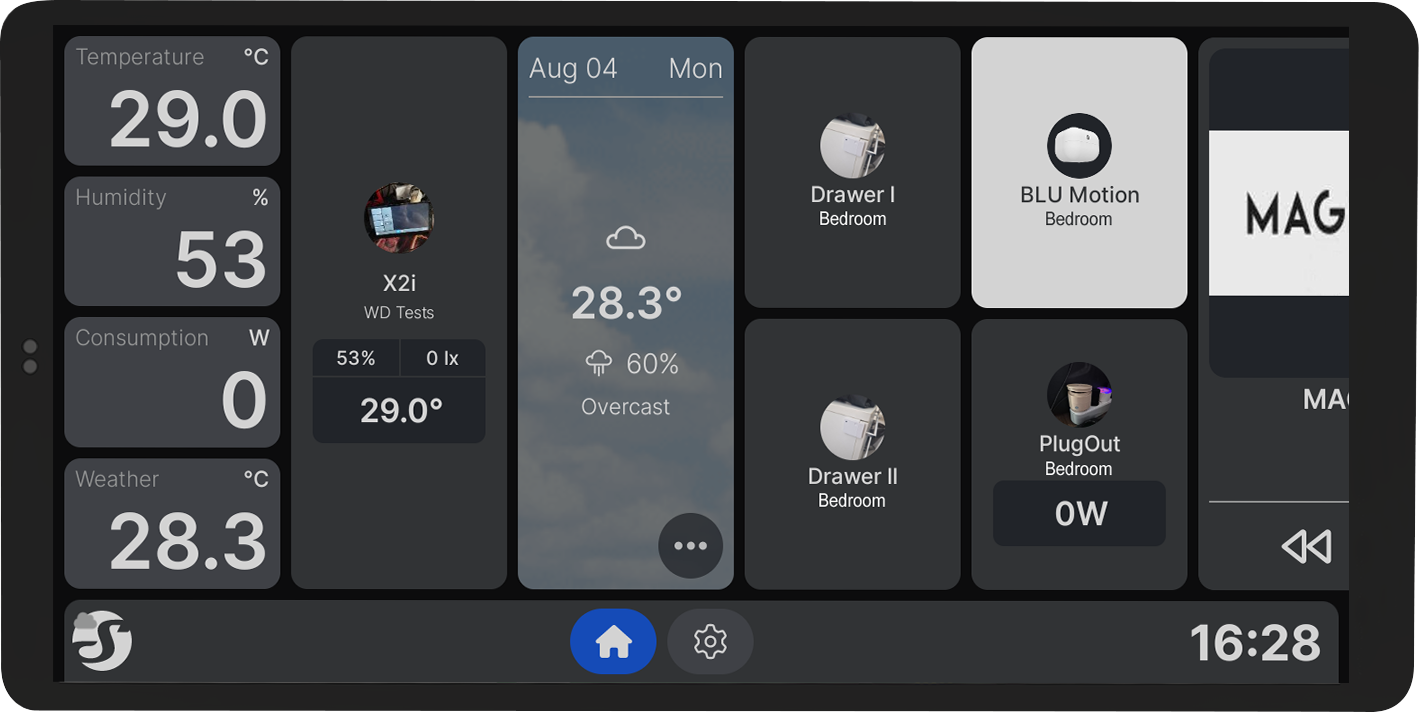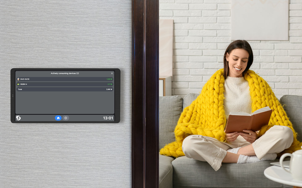 Smart-Home-Bedienpanel mit 6,95"-Farb-Touchscreen, ultraschnellem Quad-Core-Prozessor und austauschbarem Strommodul. Enthält ein Strommodul mit einem Ausgang für die Steuerung eines einzelnen Stromkreises.