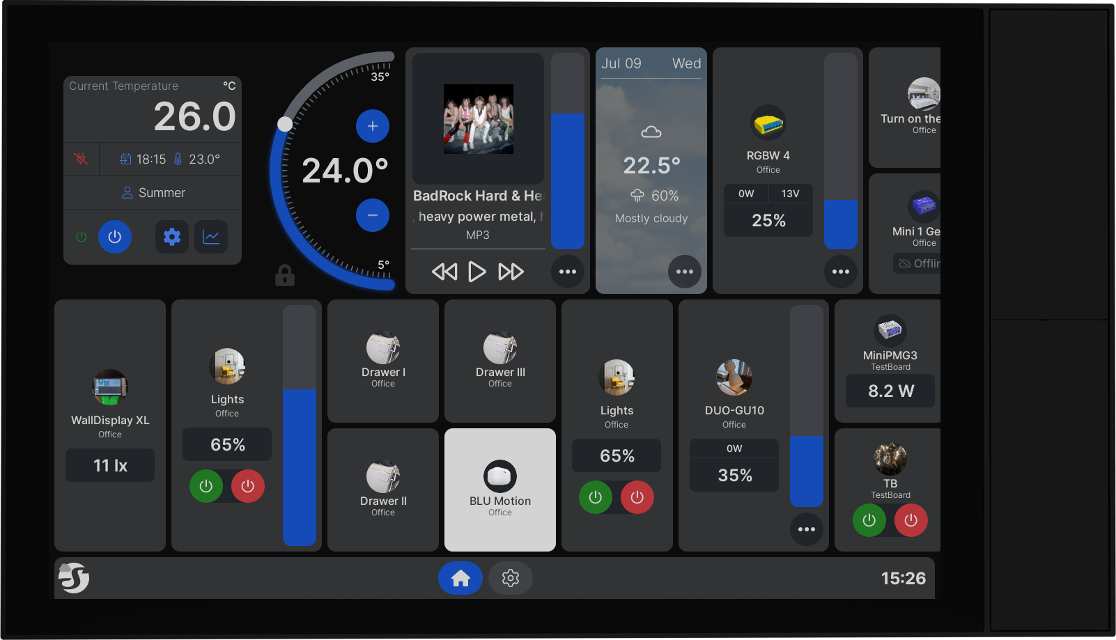 Smart-Home-Bedienpanel mit 10,1"-Touchdisplay, integriertem Schaltrelais und vier individuell konfigurierbaren Tasten. Lässt sich in eine Standard-Unterputzdose installieren und gibt Dir die volle, einfache Kontrolle über Deine Shelly Geräte – ideal für Häuser, Wohnungen, Hotels und Gewerbeflächen.