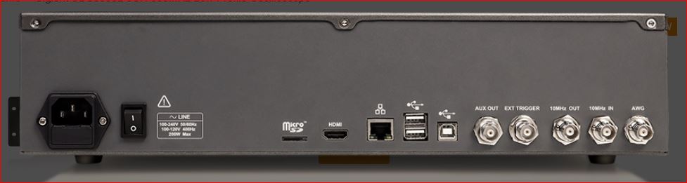 - Zu den Schnittstellen gehören: 4x USB-Hosts, USB-Gerät (USBTMC), 1000 M LAN (VXI-11/ Telnet/ Socket), Micro-SD-Karte, Pass/Fail, Trigger-Ausgang, HDMI, 10-MHz-Eingang, 10-MHz-Ausgang