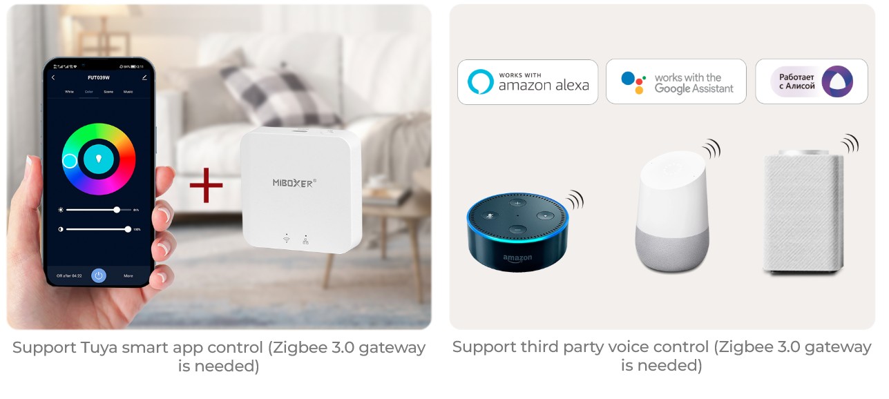 - Support third party voice control like Alexa, Google assistant,Yandex Alice, Tmall Genie,Baidu and Xiaomi (Zigbee 3.0 gateway is needed)