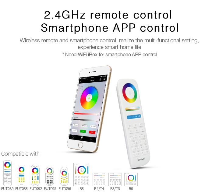 Steuerbar mit Funkfernbedienung und/oder WLAN Controller für iOS und Android, beide separat erhältlich, siehe Zubehör