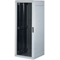 Geschweißter Standschrank für Belastung 800 kg, in Stahlblechausführung, IP 20. Luftschlitze seitlich im Dach- (Lüftungsdom) und Bodenteil. Verblendete Kabeldurchführungen und Montageplätze für Belüftungseinheit im Dach-und Bodenteil. Alle Teile zusammengeerdet, Sternpunkt vormontiert. Zwei Paar (ab Schranktiefe 900 mm drei Paar) 19“ vertikale Montageschienen, verzinkt, verstellbar. Alle Höheneinheiten an den Montageschienen gekennzeichnet und gegenläufig durchnummeriert.