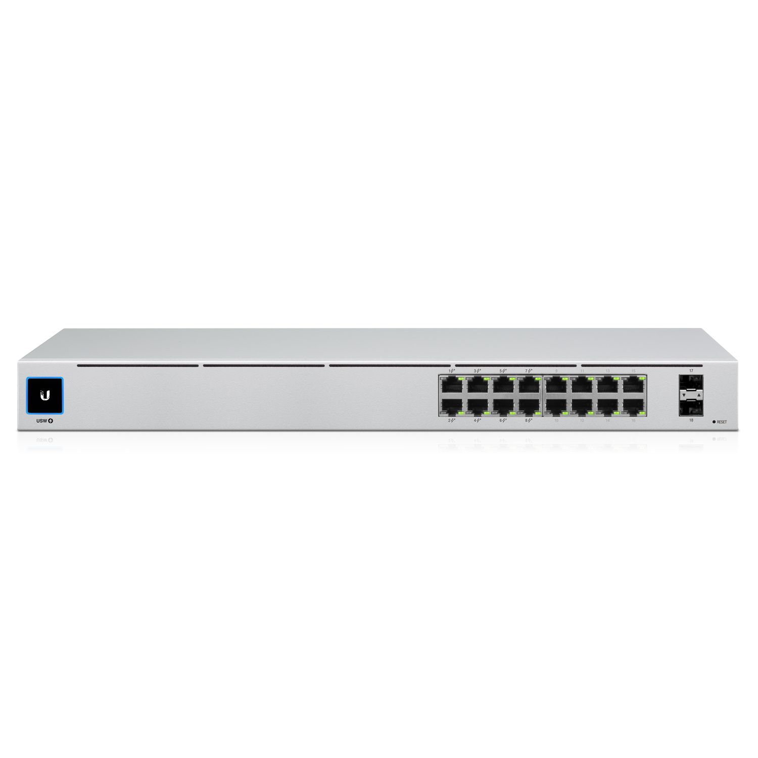 Produktinformationen "Ubiquiti Switch smart managed Layer2 18 Port • 16x GbE • PoE Budget 42W • 8x PoE at • 2x SFP • 19" • Lüfterlos • UniFi • USW-16-POE"