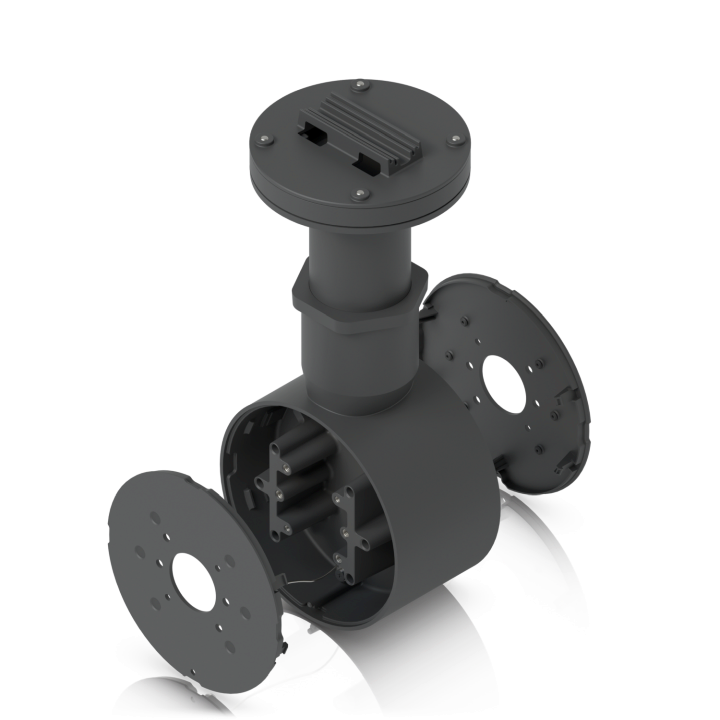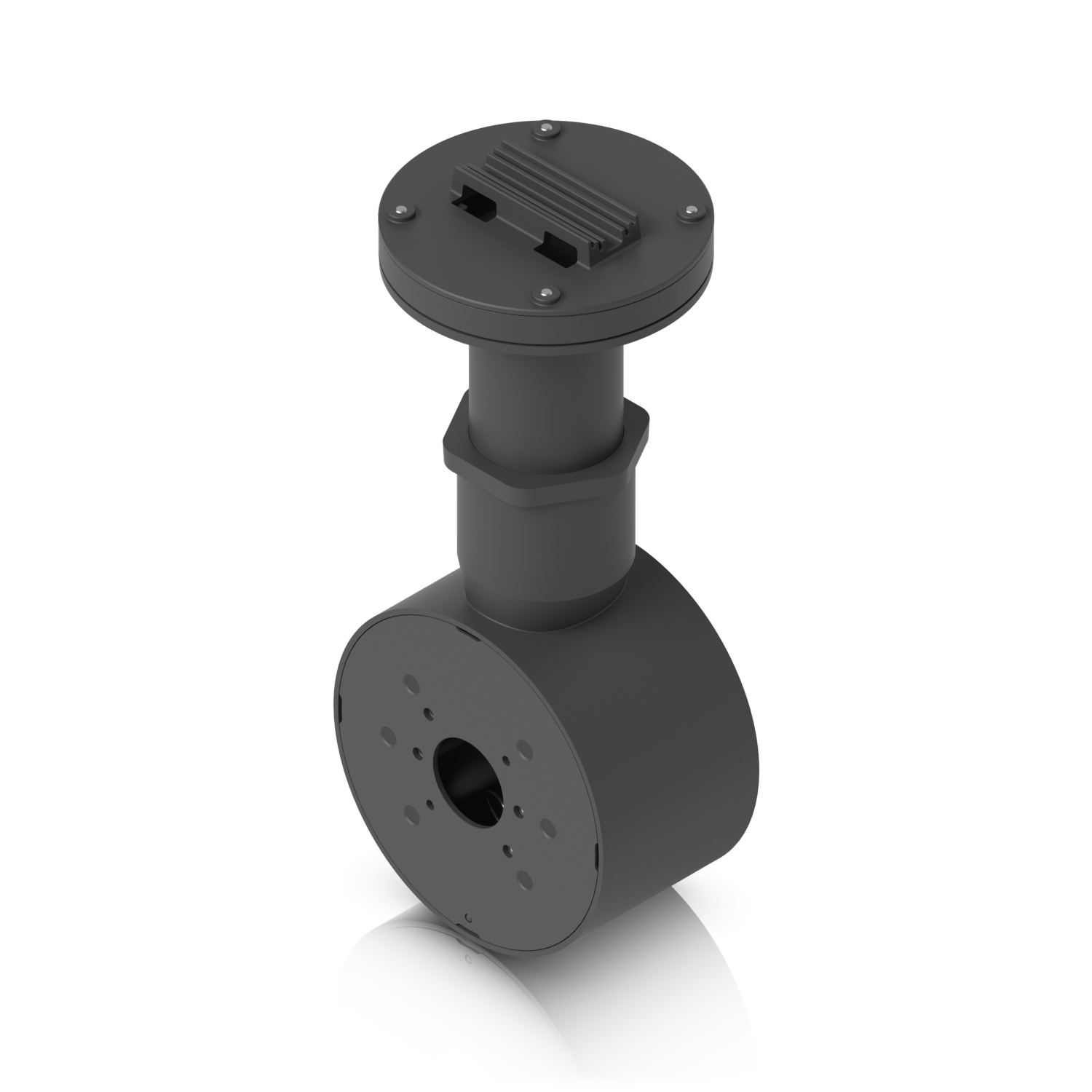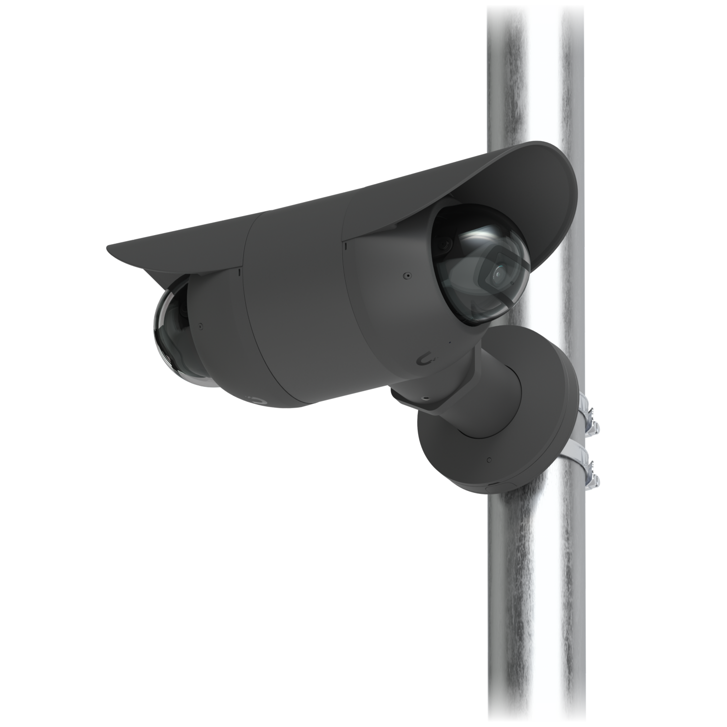 Manipulationssichere Rücken-an-Rücken-Halterung für zwei UniFi Bullet-, Dome- oder Turret-Kameras, die die Installation auf flachen Oberflächen und die Befestigung an 1 1/2" NPS-Gewinderohren unterstützt.