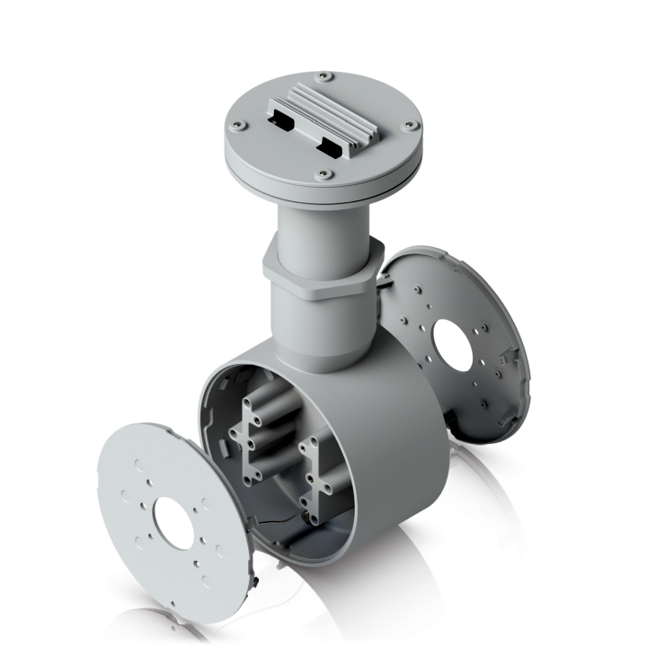 Manipulationssichere Rücken-an-Rücken-Halterung für zwei UniFi Bullet-, Dome- oder Turret-Kameras, die die Installation auf flachen Oberflächen und die Befestigung an 1 1/2" NPS-Gewinderohren unterstützt.