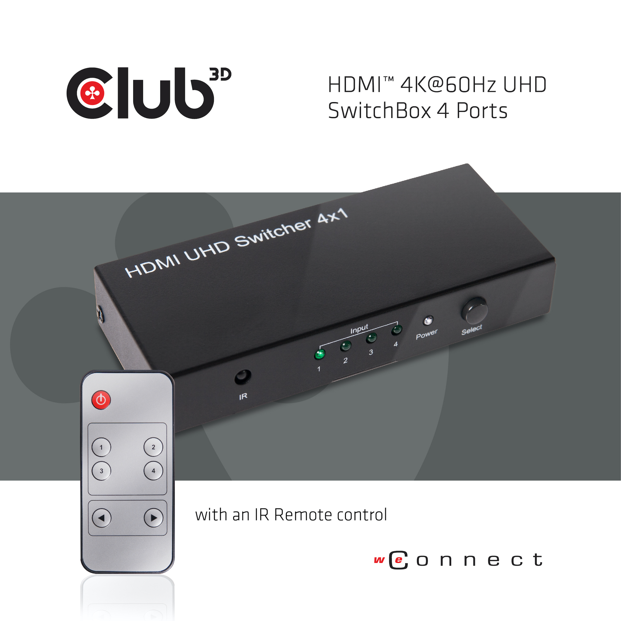 • Eingänge: 4x HDMI Buchse • Ausgänge: 1x HDMI Buchse • Unterstützt sowohl mechanische als auch intelligente Switching • Unterstützte Auflösungen bis zu: 4096x2160p bei 60Hz • Unterstützt Full 3D • HDCP durchlaufen • Unterstützt komprimiertes Audio wie DTS Digital, Dolby Digital • EDID-Umgehung • Unterstützt CEC-Funktion • Kartongröße: 180x137x80mm • Produktgröße: 122x50x20mm • Produkt Gewicht: 150g • Erfüllte ROHS, FCC und CE EMI Anforderungen • In der Verpackung: HDMI 4K 60Hz UHD SwitchBox 4 Ports, Power Adapter (5V/1A), IR-Fernbedienung / Lithium Batterie JAPAN STD CR2025, Manual