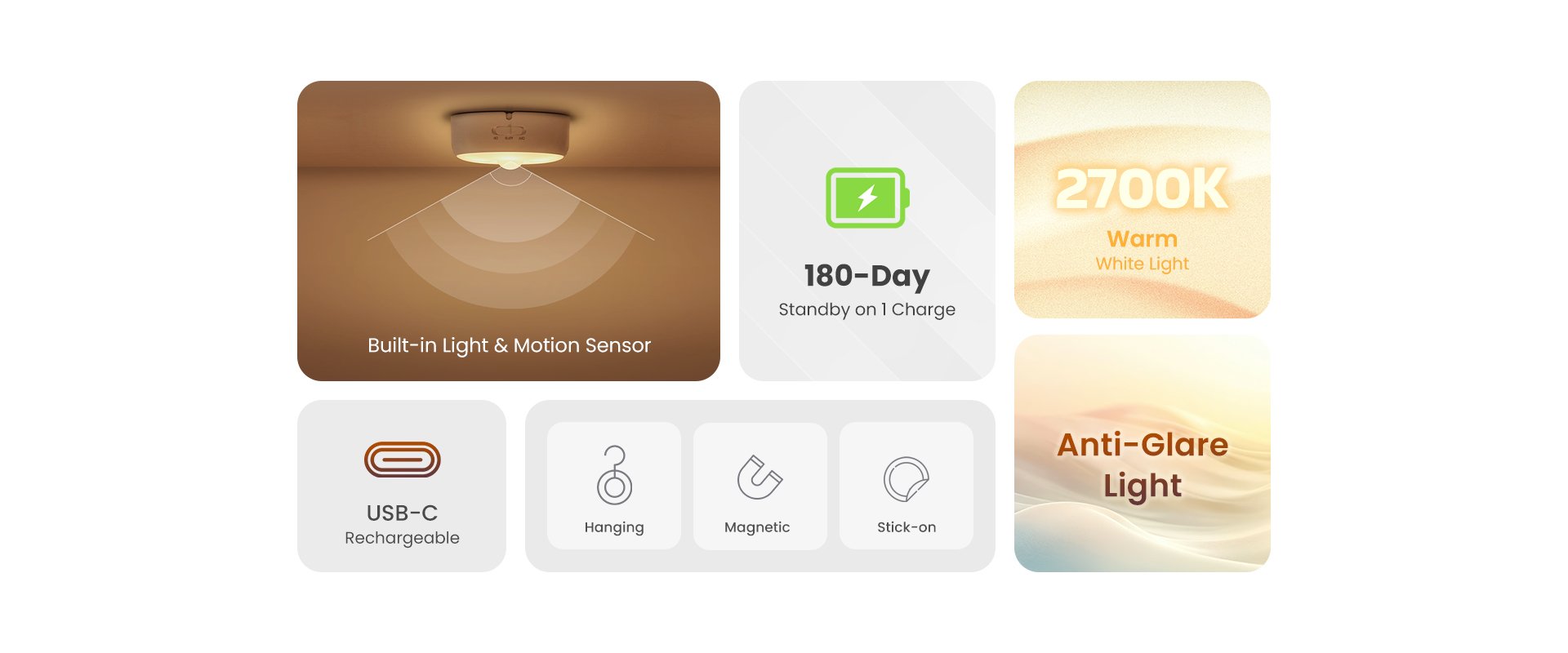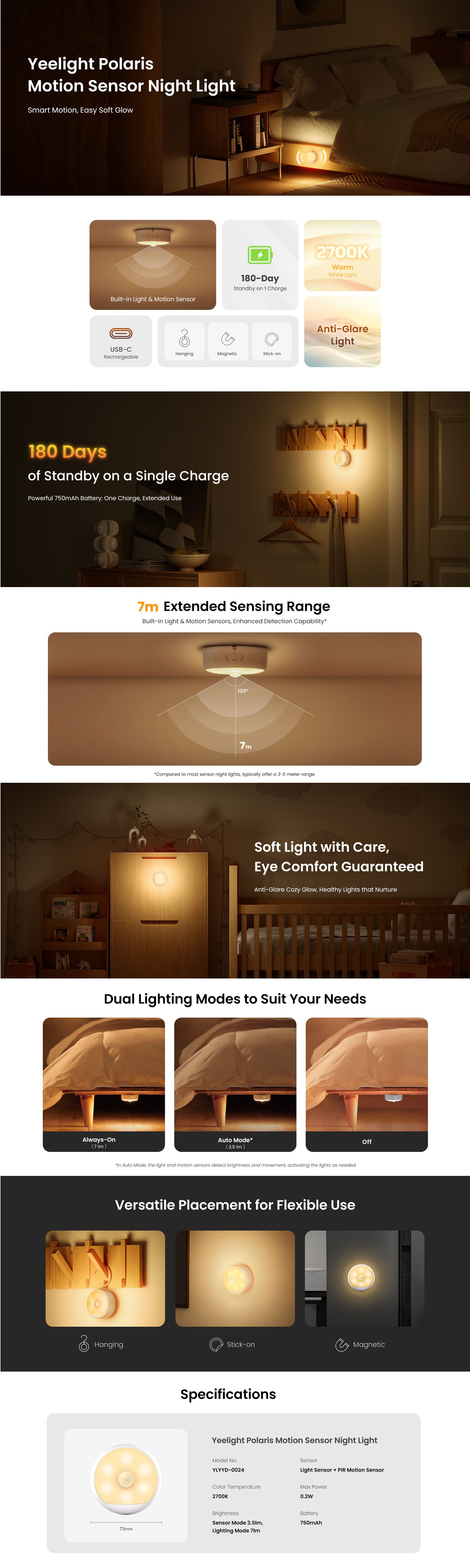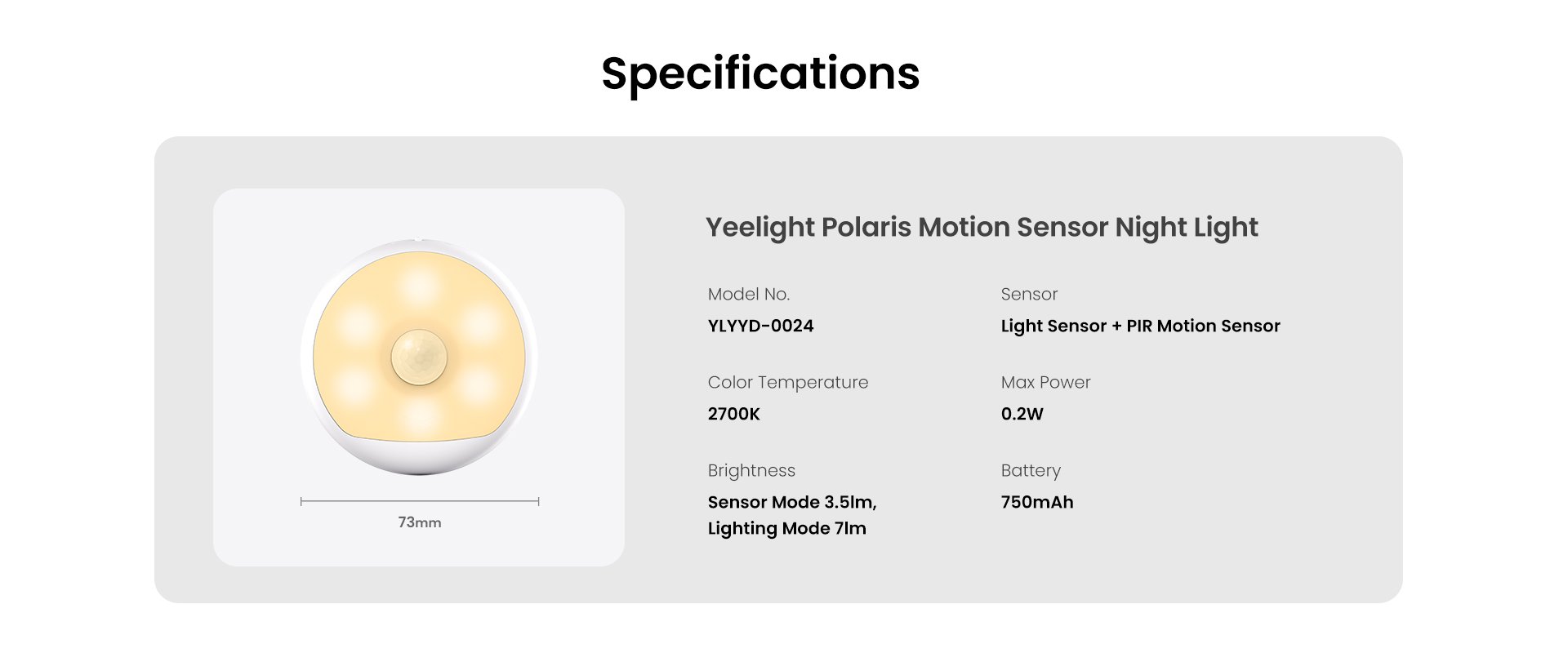 Model No.: YLYYD-0024 Color Temperature: 2700K Brightness: Sensor Mode 3.5lmLighting Mode 7lm Sensor: Light Sensor + PiR Motion Sensor Max Power: 0.2W Battery: 750mAh